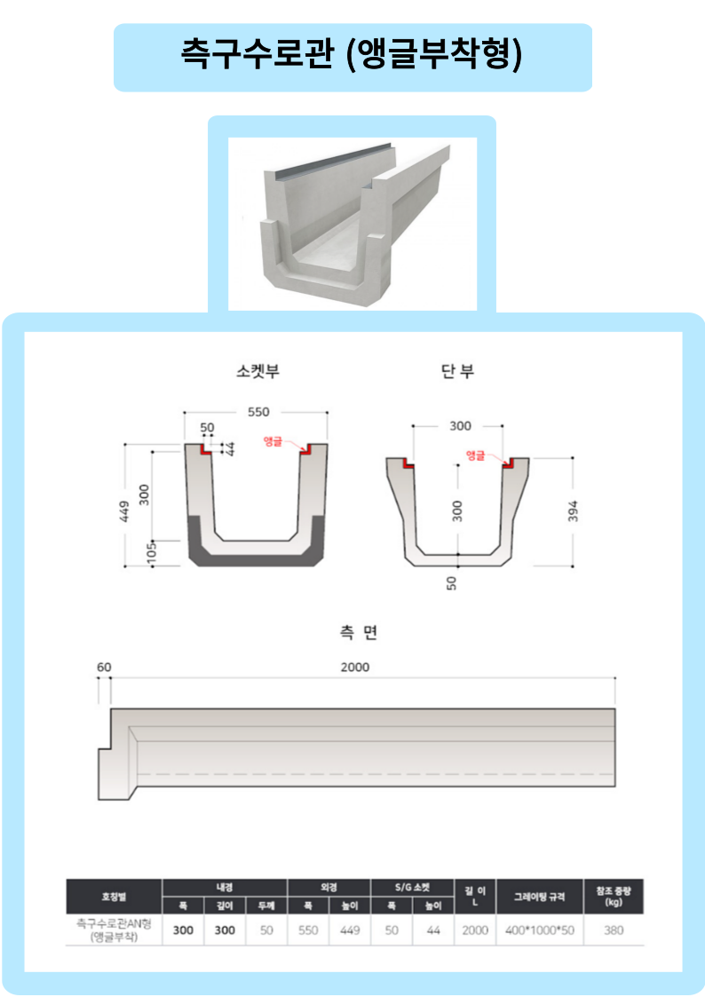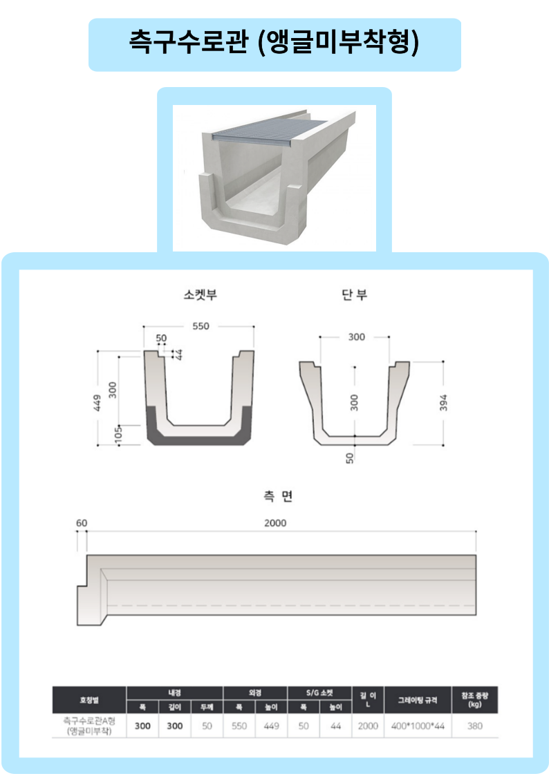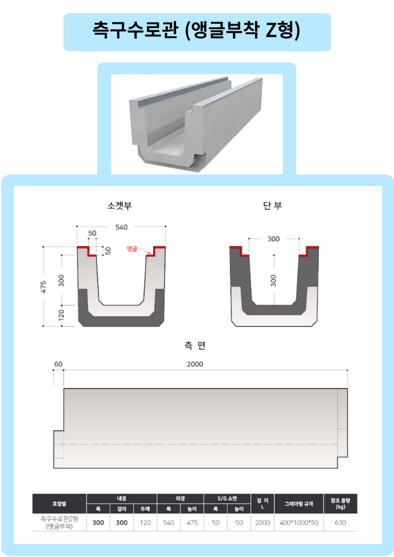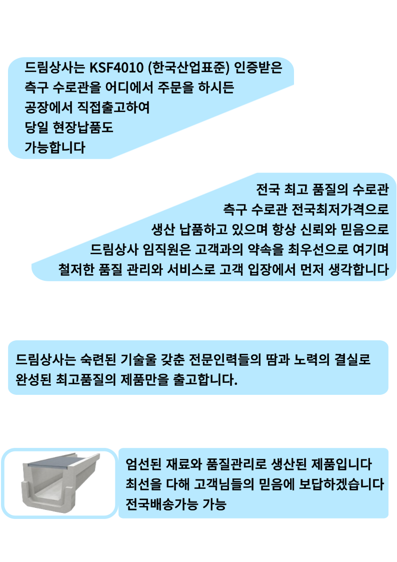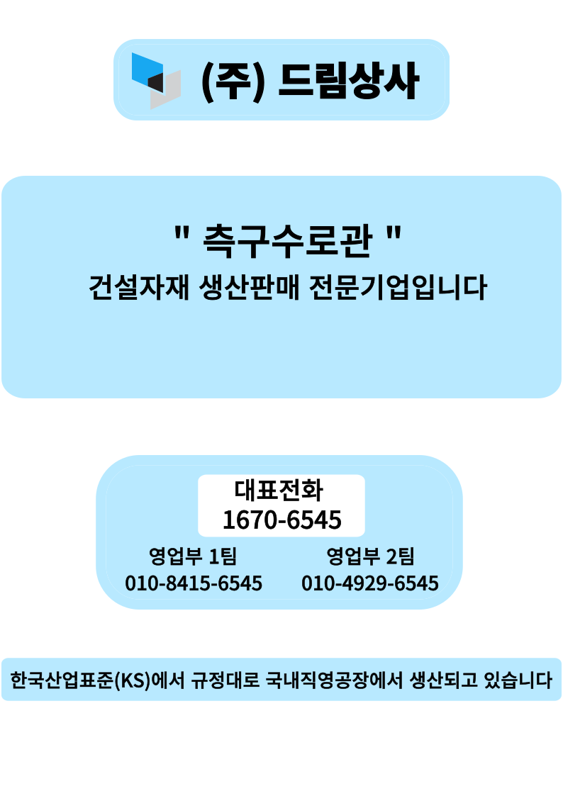(주)드림상사는 철저한 품질관리와 엄선된 재료로 생산된 제품을 공장에서 현장으로 직송하며 전국배송 당일출고합니다. ▣취급품목▣ 건설자재 전문기업 ▣제품소개▣ 약간씩 그 쓰임새와 필요한 현장들이 다른데요 설치, 시공이 간단하며 크게 세가지로 나뉩니다 수로관 가격 전문생산공장 전국직송판매업체 배수용으로 쓰이고 있으며 차량이 통행을 하는 경사지에 빗물을 처리한다 수로관은 앵글부착형, 앵글미부착형 올앵글형 세가지로 나뉘구요 우리 일상과 밀접한 관계가 있는 자재이며 다용도로 쓰이고 있는 제품 앵글미부착형도 표현처럼 제작중에 앵글을 설치하지않고 제작하는 수로관을 일컫는 것입니다 앵글부착형은 말그대로 제작과정중에 앵글을 설치하여 제작하는것임 주로 주택단지나 공장부지같이 자동차 운행과 연결이 되어 빗물이 모여서 하수도로 연결 되게끔 하기 위한 콘크리트 플륨관 배수로 직선과 곡선의 유지 시공이 쉬우며 자연과의 조화가 보기 좋게 이루어지는 게 가능하여서 여기저기 폭넓게 쓰이고 있는 수로관 인데요 철근 콘크리트 대용으로 사용이 가능하며 누수예방과 더불어 경제성이 강하고 동파의 우려가 없기 때문에 토압 같은 외압에 의한 충격이 강한 것이 특징임 구조물의 안전성이 우수하며 측벽의 토압에 대한 저항능력이 우수한 것이 특징임 차량이 통행을 하는 경사지에 빗물을 처리할수 있음 긴 구간의 도로 옆쪽에 물의 흐름을 원활하게 하기 위서 사용이 됩니다 하여서 소켓접한 부분이 견고하게 연결이 되어서 보다 작업시간이 훨씬 단축이 된다는 장점이 있습니다 경계석이나 L형측구 대용으로 설치를 하기도 합니다 동파의 우려가 없기 때문에 토압 같은 외압에 의한 충격이 강한 것이 특징입니다 주로 주택단지나 공장부지같이 자동차 운행과 연결이 되어 빗물이 모여서 하수도로 연결 되게끔 하기 위한 콘크리트 수로관 배수로이구요 주차장이나 운동장 주변 배수용으로도 주로 사용이 되곤 해요 직선과 곡선의 유지 시공이 쉬우며 자연과의 조화가 보기 좋게 이루어지는 게 가능하여서 여기저기 폭넓게 쓰이고 있는 플륨관인데요 철근 콘크리트 직접 타설 배수로 대용으로 사용이 가능 1본당 길이는 2m이며 상세도면 제공도 가능합니다 측압을 받을 필요가 없는 도로의 측구 또는 수로로 이용하며 누수예방과 더불어 경제성이 강하다 농지의 관개용 수로로 주로 이용 일정한 구배를 통한 물의 자유낙하를 유도한다 규격 종류는 크기 재질에 따라 굉장히 다양합니다 직선과 곡선 유지시공이 쉽고, 자연과의 조화가 잘 이루진다 시공시 터파기면과 수로관 바닥면이 밀착됨으로서 소켓접속 부분이 견고하게 연결되고 신속한 시공이 가능하다 ks제품 규격을 충족하는 제품이며 철근콘크리트 개거 대용으로 사용된다 배수로 주변 누수예방과 더불어 경제성을 극대화 할수있다 환경수로관은 크기가 매우 크며 양생류와 동식물 플랑크톤의 보호를 목적으로 사용된다 설치시 외측 하부와 측면 다짐이 철저해야 침하가 발생하지 않습니다 도로나 인도 등과 같은 곳에 설치되는 콘크리트 수로관입니다 차량통행 및 보행시 안전성을 확보하기 위해 설치되며 보도블럭 사이에 위치하게된다 적합한 규격의 제품을 선택하여 시공해야 합니다 토목공사에서 많이 사용되고 하천정비사업에서는 필수적인 자재이다 공급원승인서와 시험성적서등을 발급이 가능하다 저렴한 가격으로 유수량 확보가 용이합니다 시공이 간단하며 주차장이나 운동장 주변 배수용으로도 주로 사용이 용이하다 건축법상 자신의 땅에서 발생한 물은 인접한 토지로 따로 흘러가지 않게 배수계획을 새워야 한다 적합한 규격의 제품을 선택하여 시공해야 합니다 토목공사에서 많이 사용되고 하천정비사업에서는 필수적인 자재이다 차량통행이 극심한 곳은 더 튼튼한 올앵글부착형 수로관이 필요하다 앵글미부착형 주로 차가 다니지 않는 곳에 설치하는 수로관이다 앵글부착형은 보통 차량통행이 어느정도 있는 곳에 사용하는 수로관이다 앵글 자체가 홈을 전체를 덮지 않고 일부만 덮은 앵글부착형 수로관을 사용한다 미부착형은 수로관 자체에 충격이 덜 가해지는 수로에 설치한다 사람들이 많이 지나다니느냐에 따라 선택하는것이 일반적이다 올앵글형 앵글부착형 앵글미부착형 크게 세가지로 나뉜다 수로관의 홈을 보호해주는 역할은 하는것이 앵글이다 차나 사람이 지나다니는곳에 일반적으로 사용하며 길을 걷다보면 많이 보실 수 있습니다 사람들이 안전하게 지나다닐수 있도록 위에 트렌치를 설치한다 콘크리트 수로관에 홈이 있는것을 측구라한다 인조 잔디가 깔려진 운동장이나 보도 근체에 흔히 설치한다 설치된 위로 차들도 지나다닐수 있다 콘크리트 수로관은 차량의 하중을 잘 견딘다 하중을 상대적으로 많이 받는 곳에 사용한다 올앵글형은 강한 압력에도 잘 견딜수 있다 미부착형에는 경량 그레이팅을 사용한다 건물의 축면 도로옆 측구에 주로 설치되며 도보용으로 사용되는 제품이다 산마루측구 도로측구 레저시설의 배수로로도 활용가능하고 배수로의 토지 점유율을 최